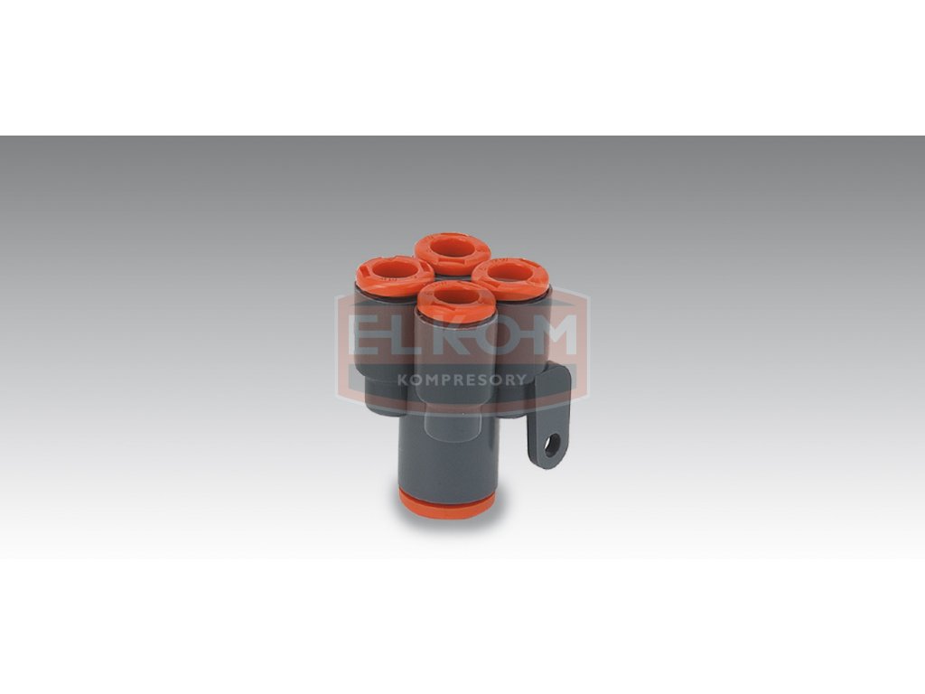 Nástrčná dvojitá rychlospojka Y-kus s připojením 6 mm a 4x výstupem 4 mm pro plastové hadičky.