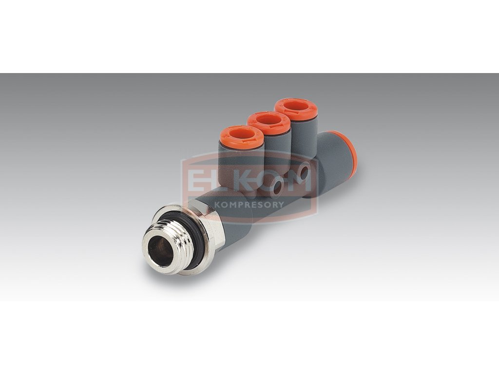 Nástrčná multirychlospojka se závitem G 1/8"a 3x výstupem 6 mm a 1x 8 mm pro plastové hadičky.