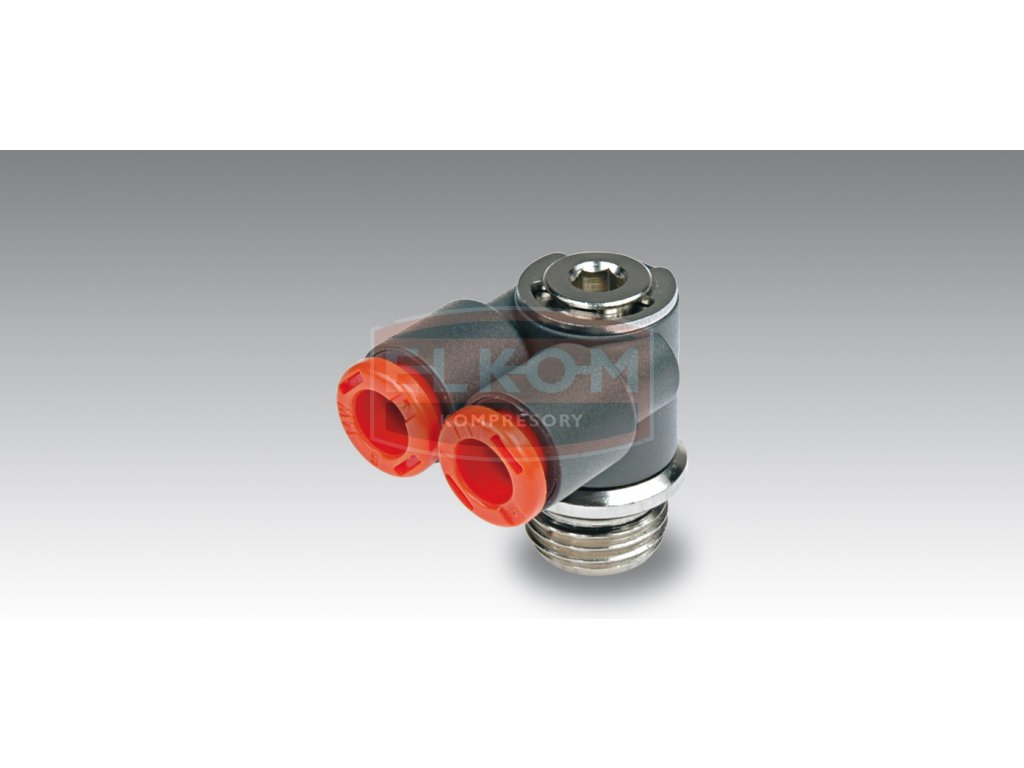 Nástrčná rychlospojka závitová úhlová Y-kus s připojovacím závitem G 1/8"a a 2x výstupem 4 mm pro plastové hadičky.